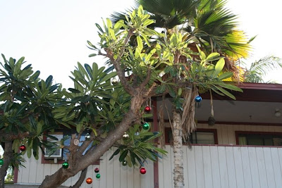 The Plumeria around here look like sticks right now – this one is so big and beautiful. Your Christmas Tree made me smile!
